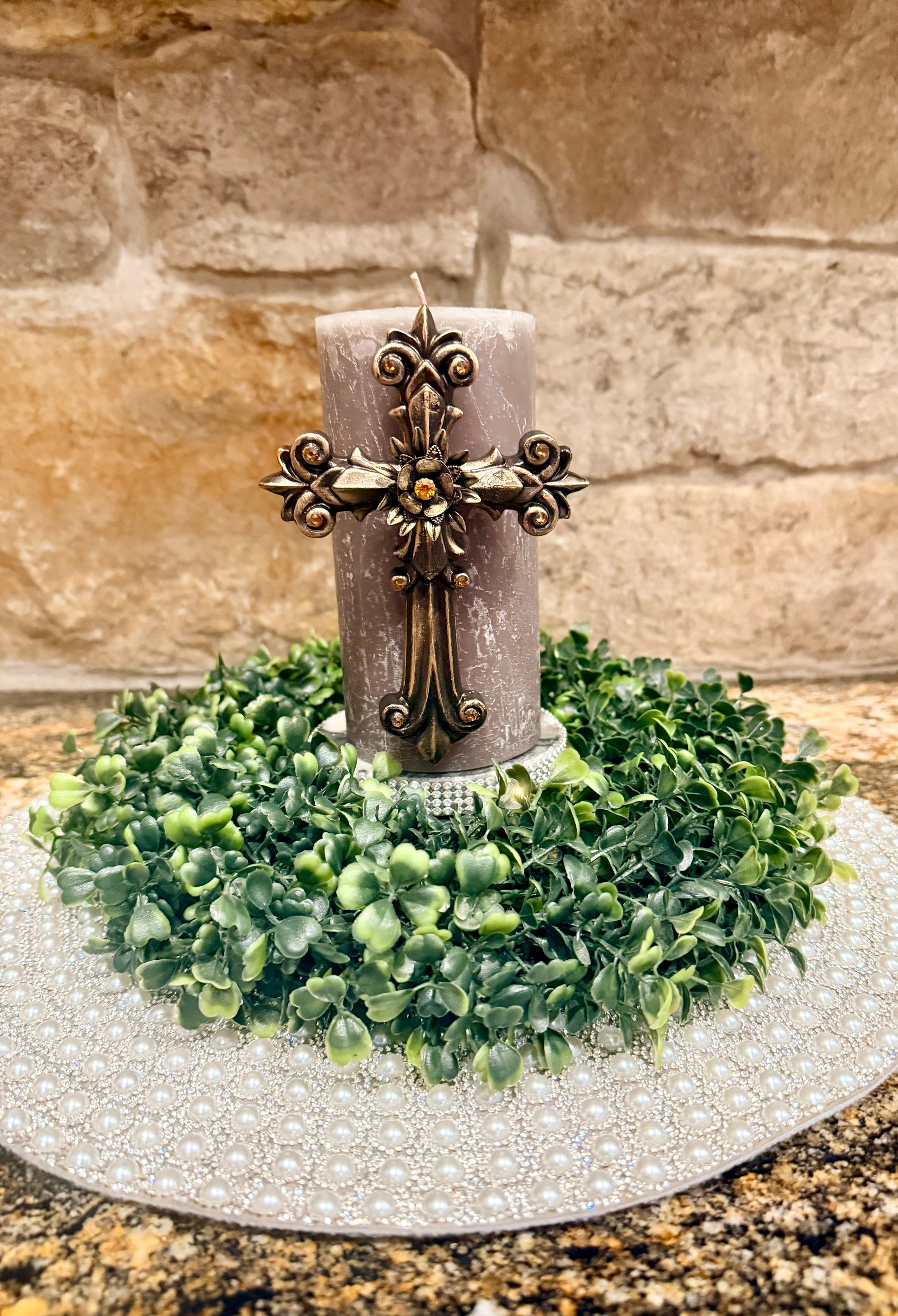 Beautiful large handmade embellished cross candle pin/lampshade pin. Sprinkled with topaz Swarovski crystals and one vintage rhinestone and pearl pendant in center. Reusable. Pin has a thumbtack secure to back side for easy on and off use. Pins measure approx. 5”wide by 7” tall. Custom orders and colors available. Please message for details. Handmade in the USA. Unique gift, home decor, thank for shopping!