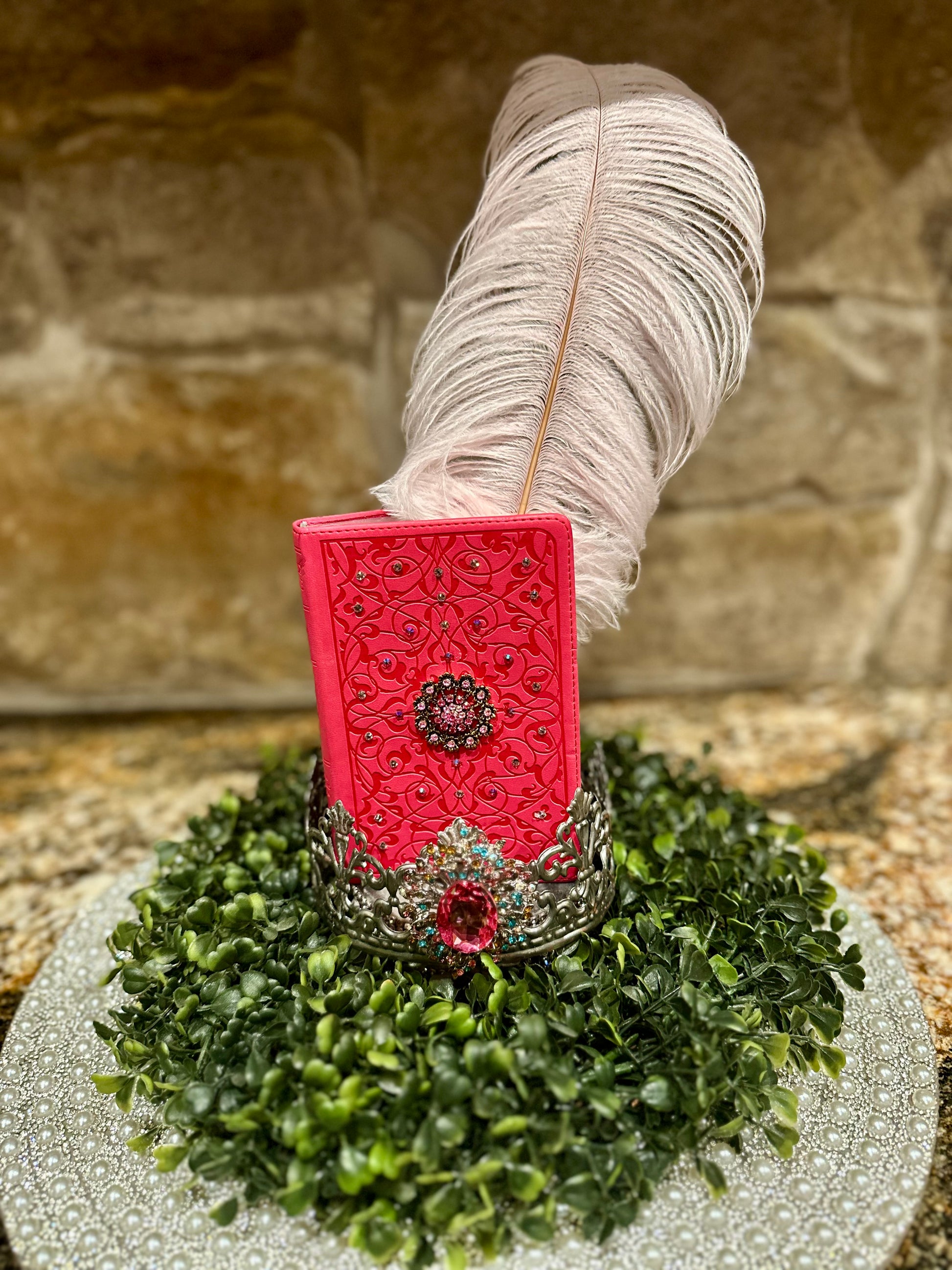 This magnificent Bible is adorned with a vintage broach and matching pink rhinestones, making it a one-of-a-kind piece. With a bright pink cover, this upcycled treasure features The Holy Bible with both Old and New Testaments in English Standard Version. It contains 893 pages and measures approximately 6.25"Hx4.25"Wx1"D. Perfect for gifting or displaying in a home or office, the interior pages are blank and can be personalized by the new owner.