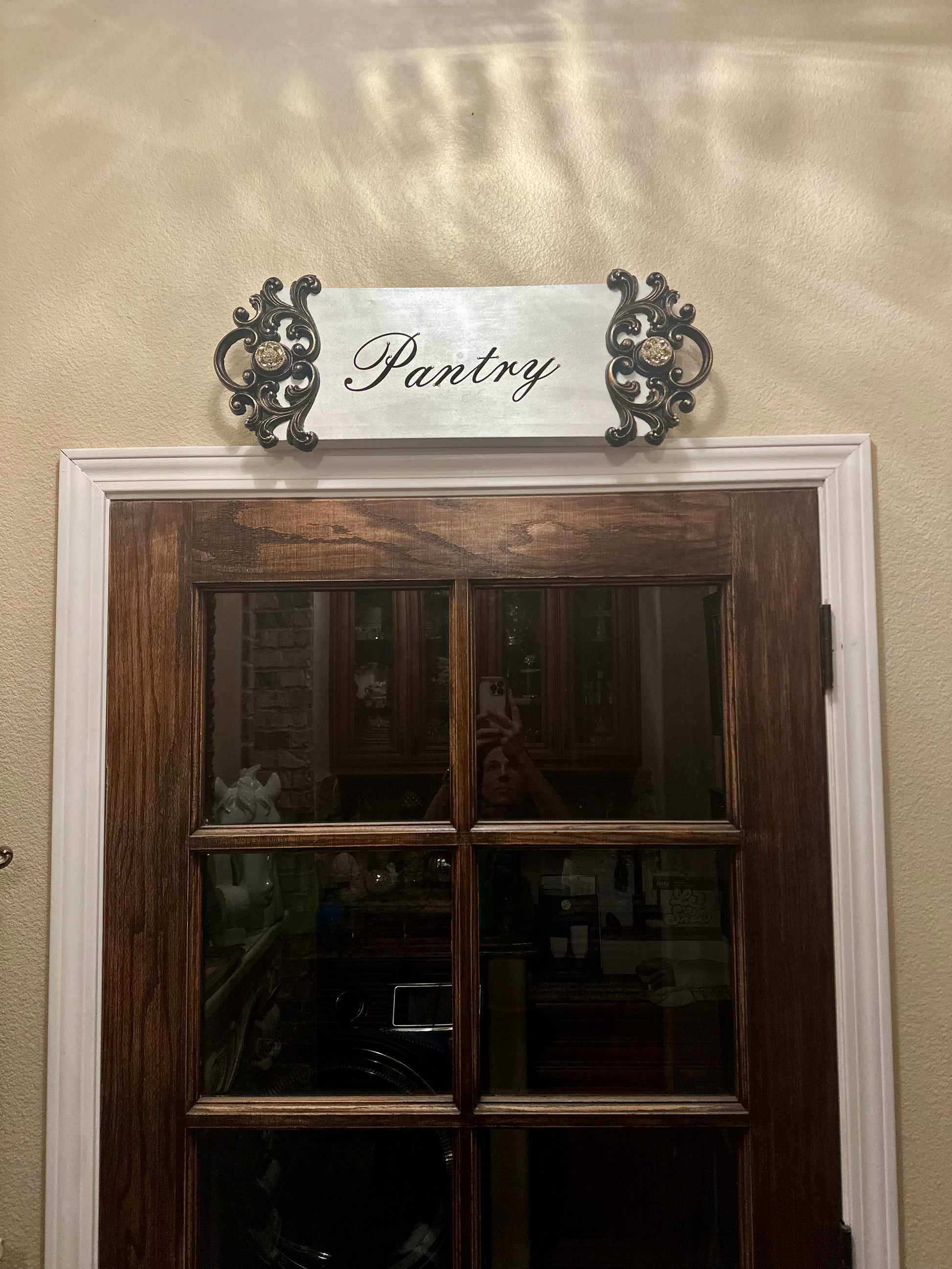 Beautiful upcycled wood decorative tray/plate personalized/customized to customers preference. This specific listing is for the “Pantry” sign. This upcycled canvas surface is hand done in a plaster faux type style and custom painted a pearl beige color. “Family” is hand stenciled onto plaster in a bronze color. Baroque handles are hand made using a resin and custom painted in matching bronze paint color to compliment the same bronze finish used in “Family” and topped off with champagne Swarovski crystals and two vintage broach pieces. Other custom sign examples include “sister”, “nona”, “home”, etc. makes a beautiful and customized gift for any occasion. Baroque style handles are hand made pouring resin, painted and adorned with Swarovski crystals. Sign measures approx. 24”Wx8”T. The top and bottom of sign are hand stenciled in a European baroque style swirl (see pic). Handmade in the USA. No two are alike making this piece truly one of a kind. custom orders accepted. Please message me for details. Thank you.